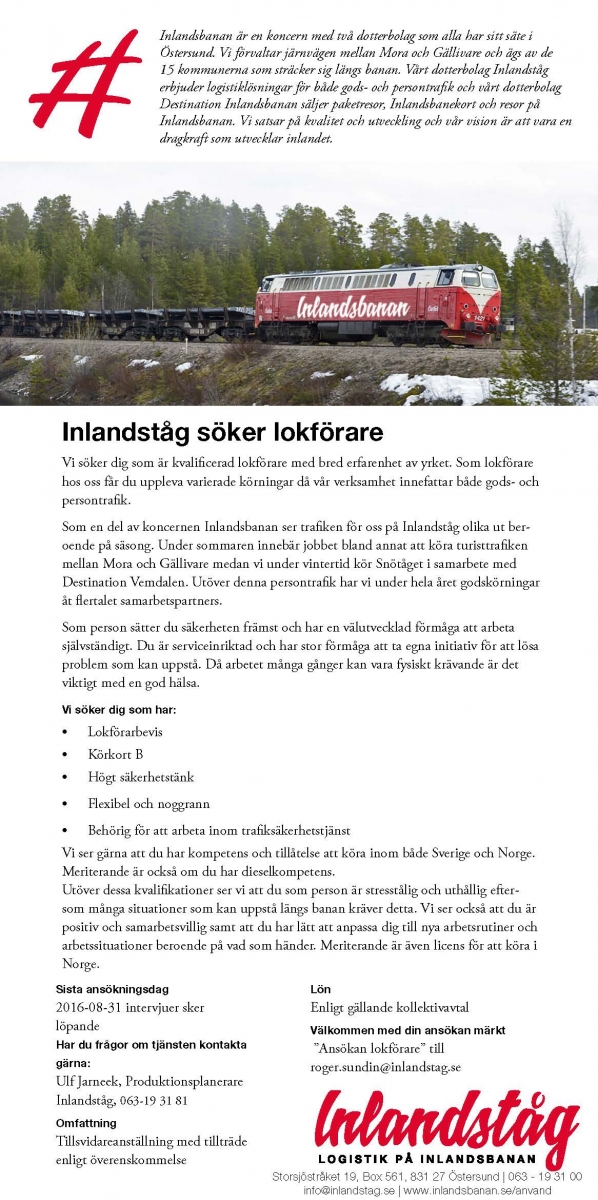 Vi söker dig som är kvalificerad lokförare med bred erfarenhet av yrket. Som lokförare hos oss får du uppleva varierade körningar då vår verksamhet innefattar både gods- och persontrafik. Som en del av koncernen Inlandsbanan ser trafiken för oss på Inlandståg olika ut beroende på säsong. Under sommaren innebär jobbet bland annat att köra turisttrafiken mellan Mora och Gällivare medan vi under vintertid kör Snötåget i samarbete med Destination Vemdalen. Utöver denna persontrafik har vi under hela året godskörningar åt flertalet samarbetspartners.