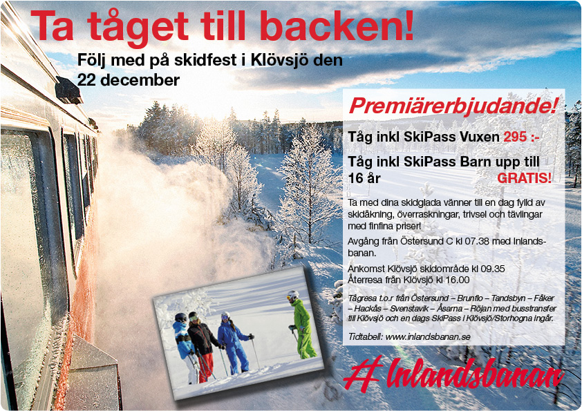 Det vill vi fira med ett riktigt bra premiärerbjudande: Tåg inklusive skipass för vuxen 295 kr, barn upp till 16 åker gratis både i tåg och skidbacken.