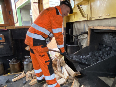 Lasse Eriksson, eldare Järnvägsmuseet skottar kol i ångloket.